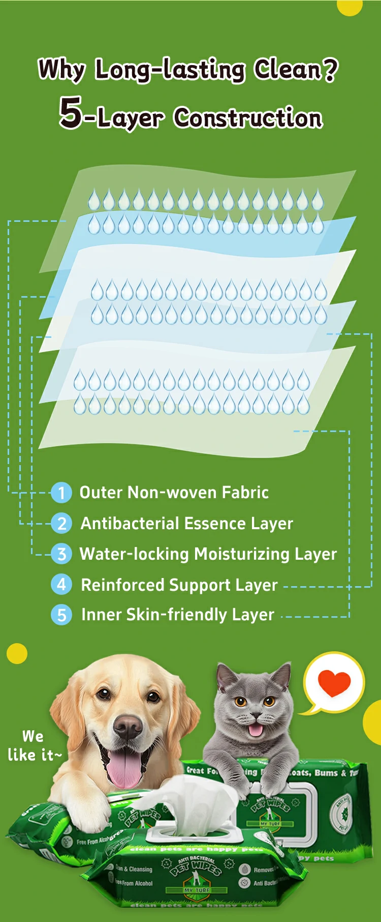 As a professional manufacturer of antibacterial organic pet wet wipes, we offer wholesale biodegradable wet wipes for dogs and cats with hypoallergenic, moisturizing, and deodorizing features. Our OEM and ODM services support branding with low MOQ and fast shipping, ideal for pet stores, grooming salons, online retailers, and veterinary clinics seeking high-quality pet cleaning products with FDA and ISO certifications.